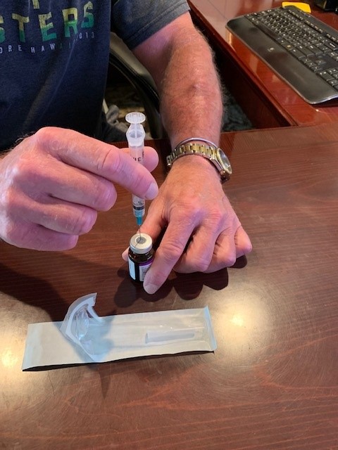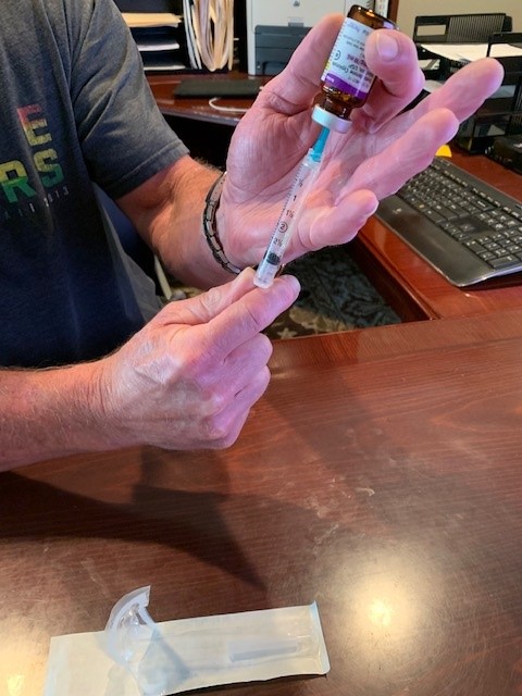 Remove the protective cap and insert the needle into the center of the rubber stopper of the vial of testosterone.