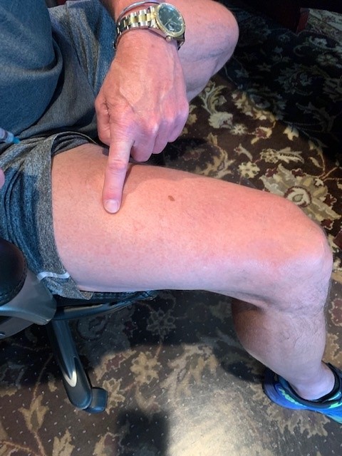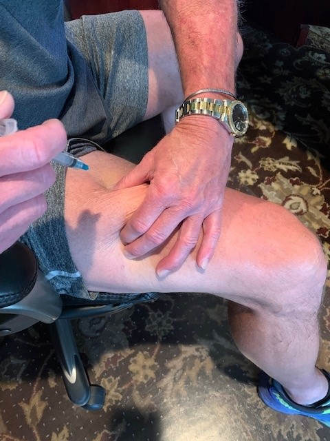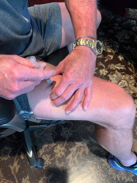 The injection site is the center of the upper leg between the kneecap and the hip socket.
